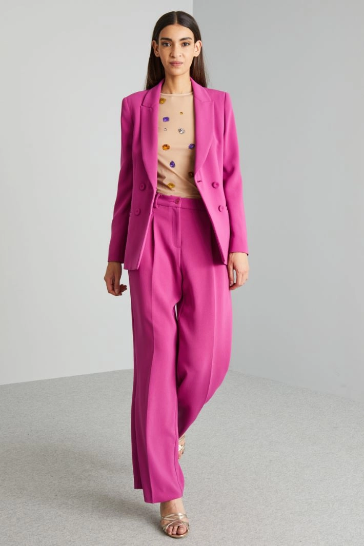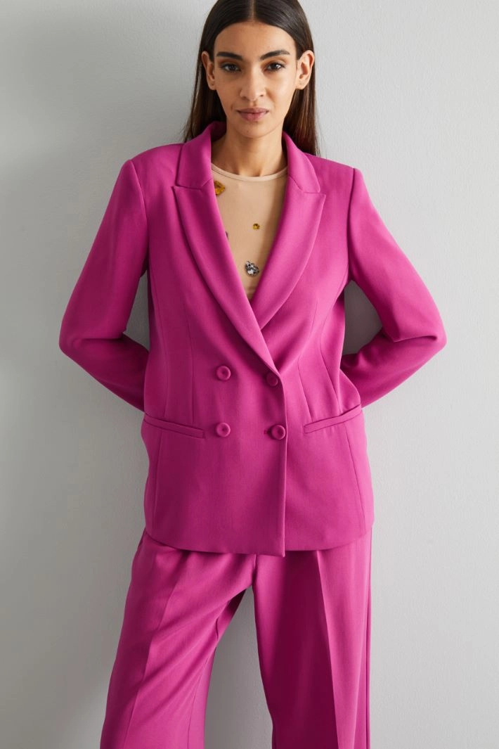 Slightly fitted cady blazer with lapel collar, long sleeves, welt pockets and double-breasted fastening with covered buttons. Lined.