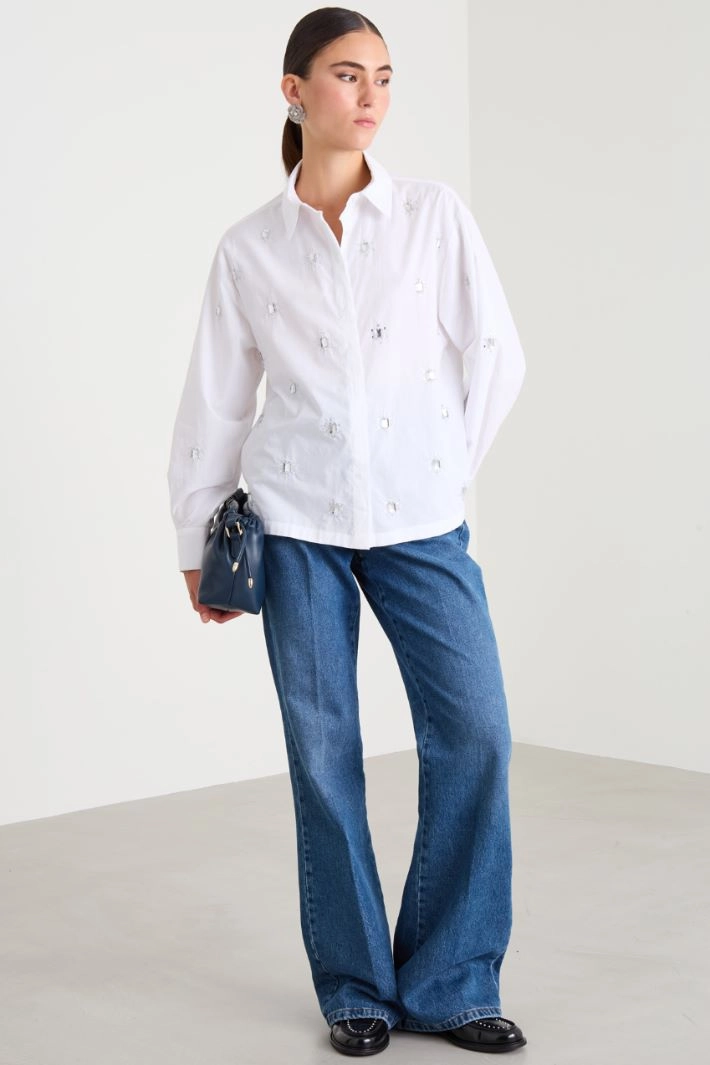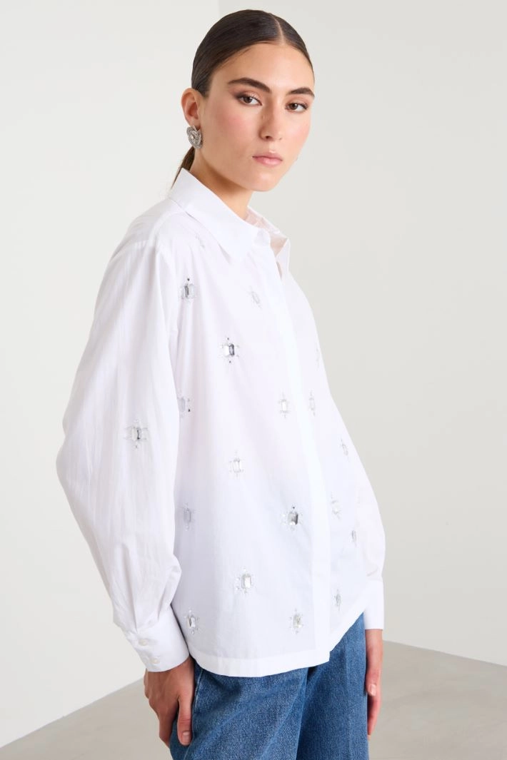 Straight-cut shirt in cotton poplin with rhinestones applied on the front, classic collar, long sleeves with cuff and buttons. Fastening with hidden buttons.