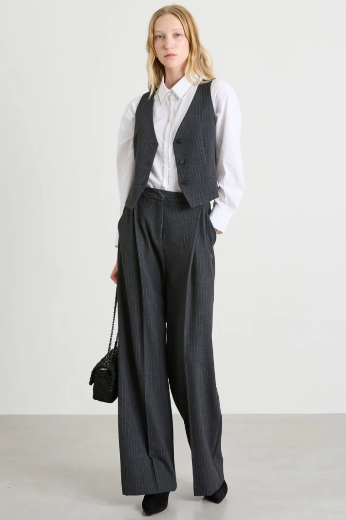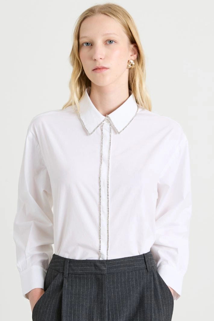 Straight-cut shirt in cotton poplin with rhinestones applied on the front, classic collar, long sleeves with cuff and buttons. Fastening with hidden buttons.