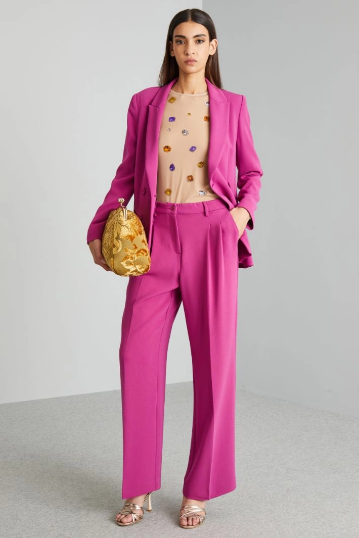 Cady palazzo trousers with waistband, belt loops and pleats sewn at the waist, French pockets and pressed pleat. Fastening with hidden zip and button.