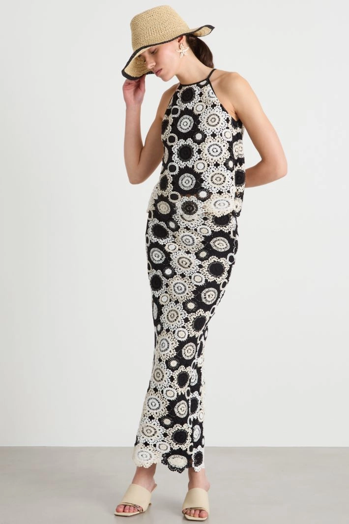 Straight-cut top in cotton-blend macramé, with a halterneck and scalloped hem. Lined. Keyhole button fastening at the back.