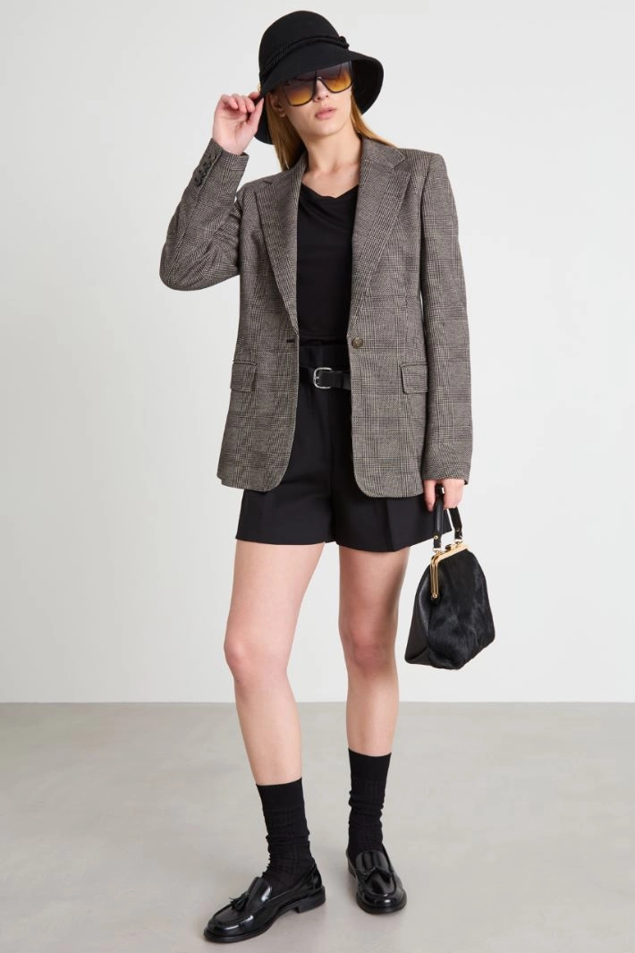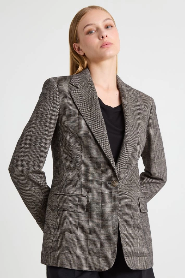 Slightly fitted blazer in yarn-dyed wool and viscose blend jersey, with lapel collar, long sleeves with buttons and double-welt side pockets with flap. Central vent on the back and single-breasted fastening with button. Lined.