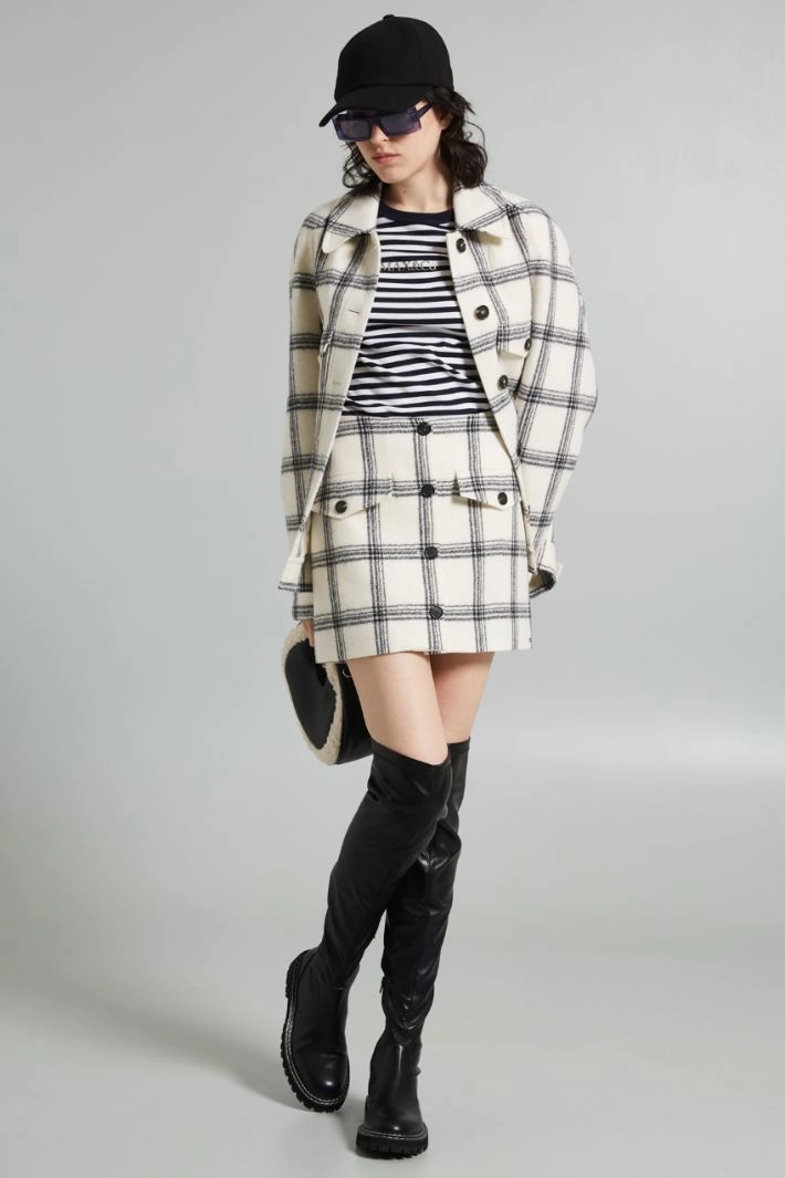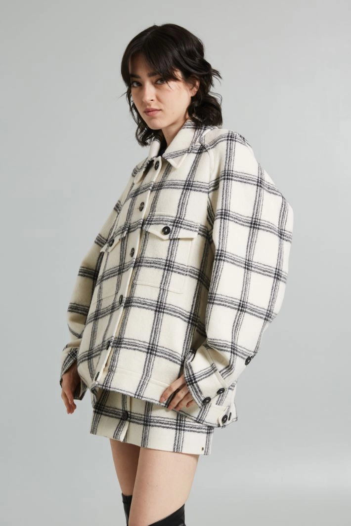 Lightly padded oversized jacket in yarn-dyed pure wool flannel, with classic collar, long raglan sleeves with cuff and buttons, patch pockets with flap on the chest, inset side pockets, straps on the back. Single-breasted fastening with visible buttons. Lined.