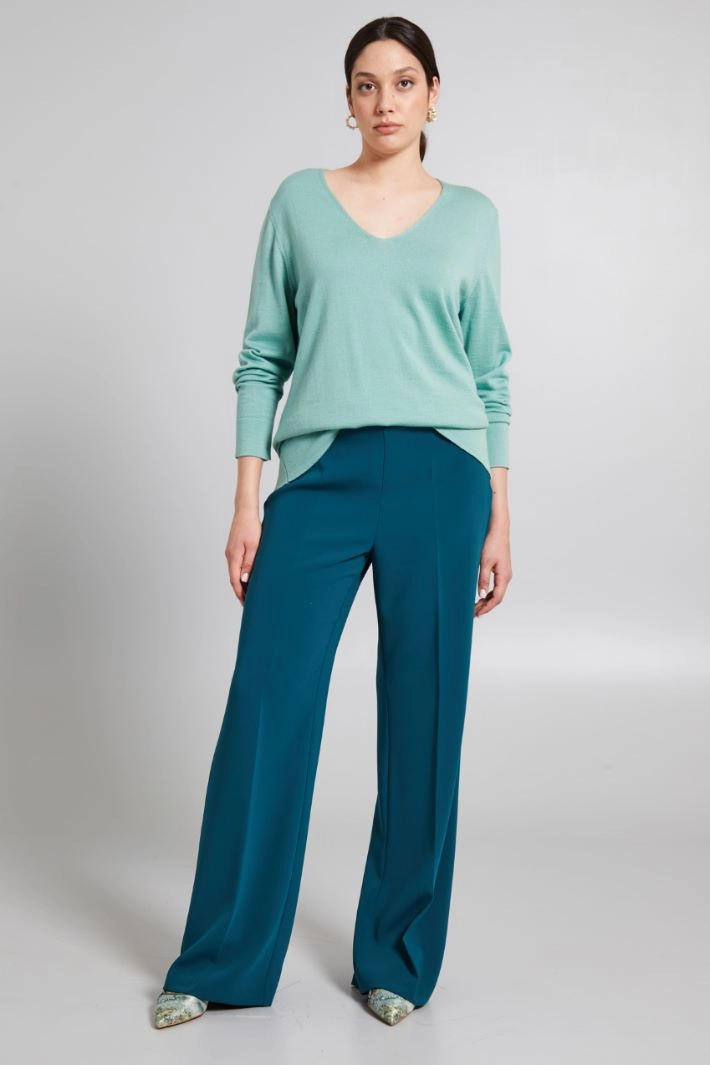 Palazzo trousers in stretch canvas, with waistband and pleats on the front and back. Fastening with zip and side button.