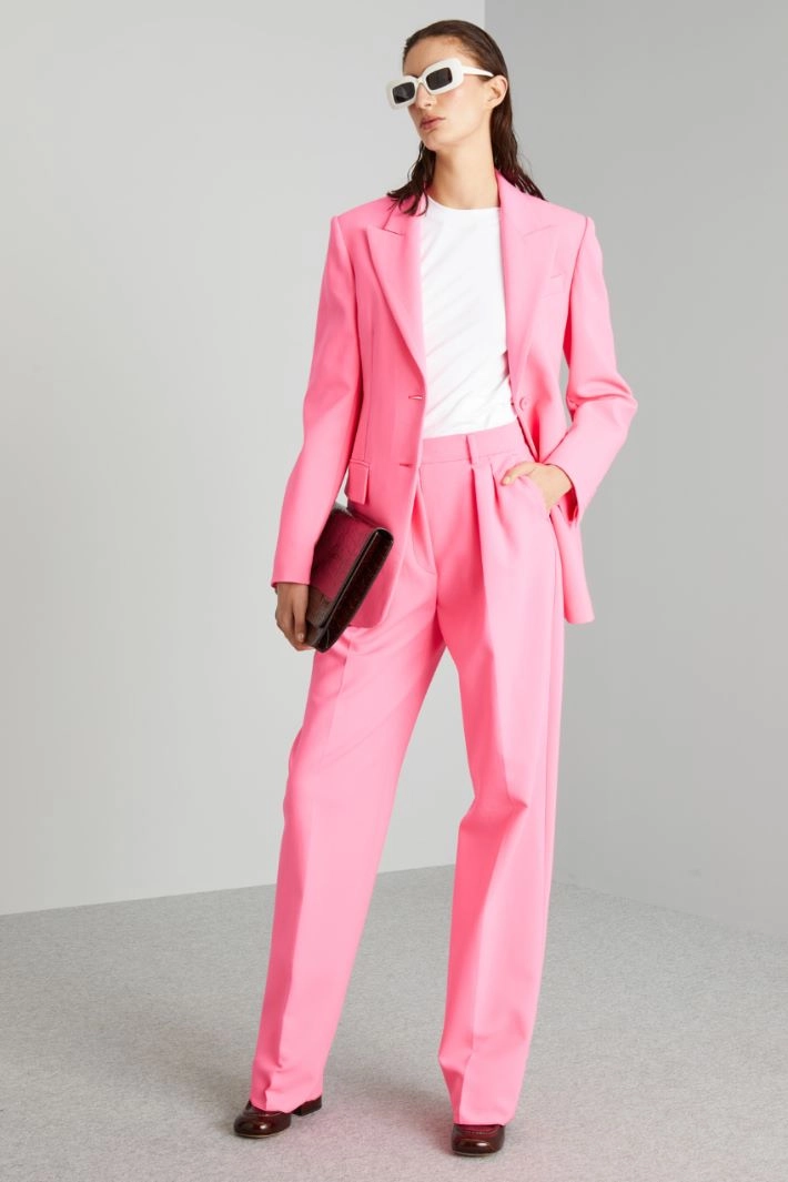 Wide-cut trousers in double pure wool fabric, with belt at the waist, sewn darts and belt loops, French pockets on the front and double welt pockets on the back. Hidden zip, button and hook closure.