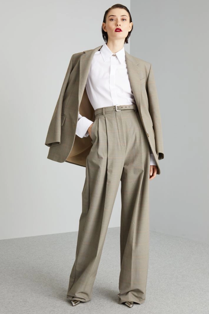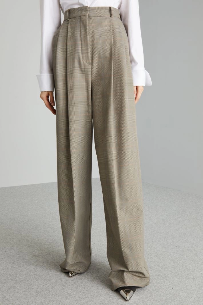 Oversized trousers in yarn-dyed stretch viscose blend batavia, with belt loops at the waist, stitched pleats, side French pockets and welt pockets on the back, hidden fastening with zip, button and hook. Coordinated belt with matching square metal buckle.