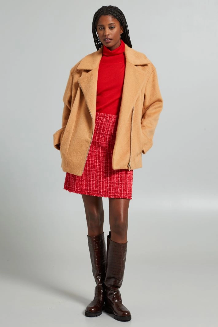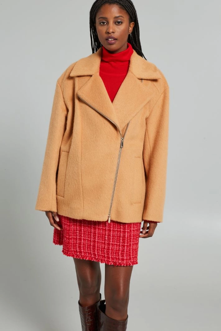 Straight-cut biker-style jacket in beaver wool blend, with lapel collar, long sleeves, welt pockets and asymmetric zip fastening. Lined.