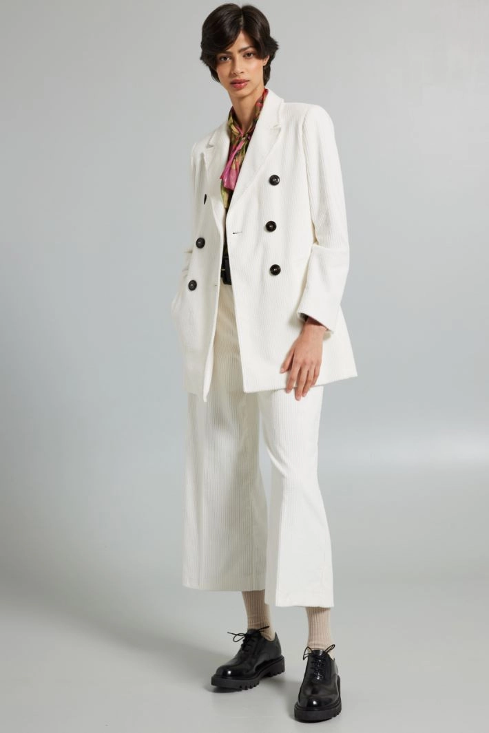 Blazer-style jacket in cotton blend corduroy, with lapel collar, long sleeves with slits at the bottom, side welt pockets and double-breasted button fastening. Lined.