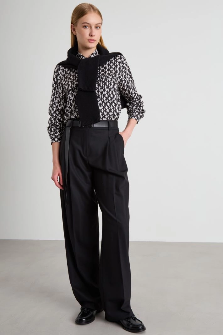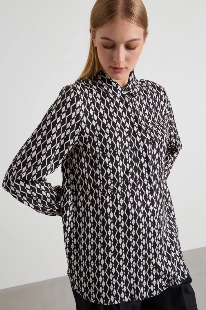 Flowing straight-fit shirt in printed twill, with classic collar, long sleeves with buttoned cuff, patch pockets with flap on the front and yoke with box pleat on the back. Concealed button fastening.