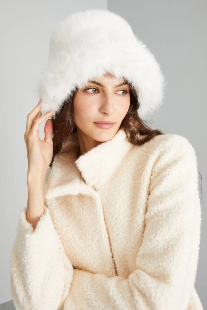 Soft hat in faux fur, with internal drawstring. Lined.