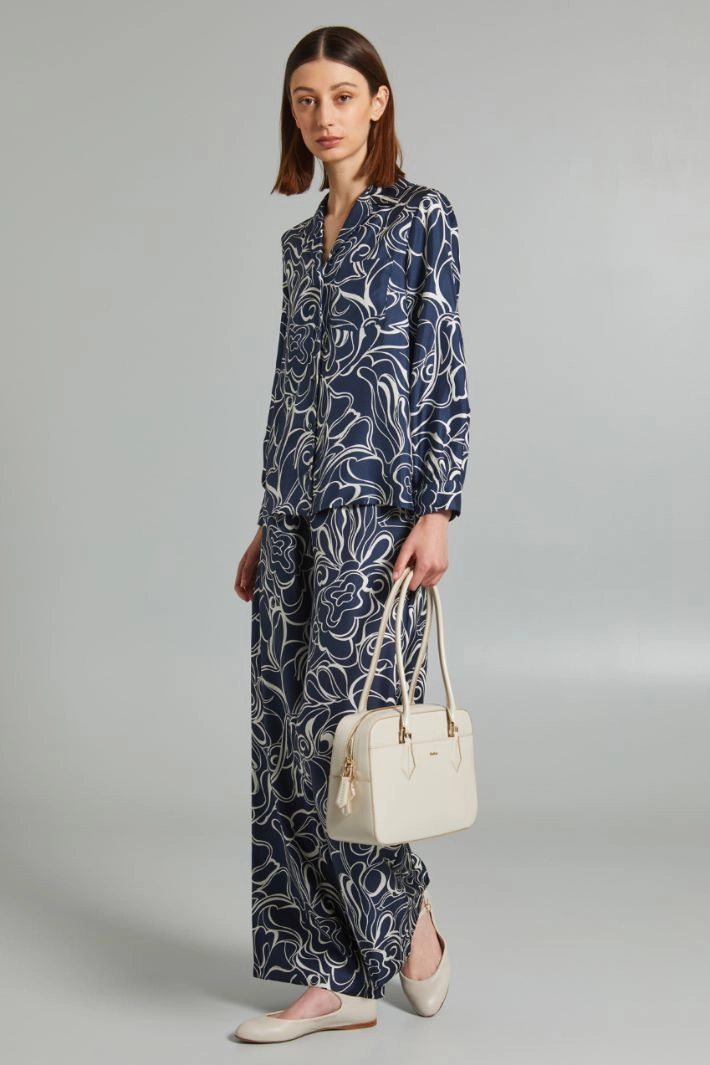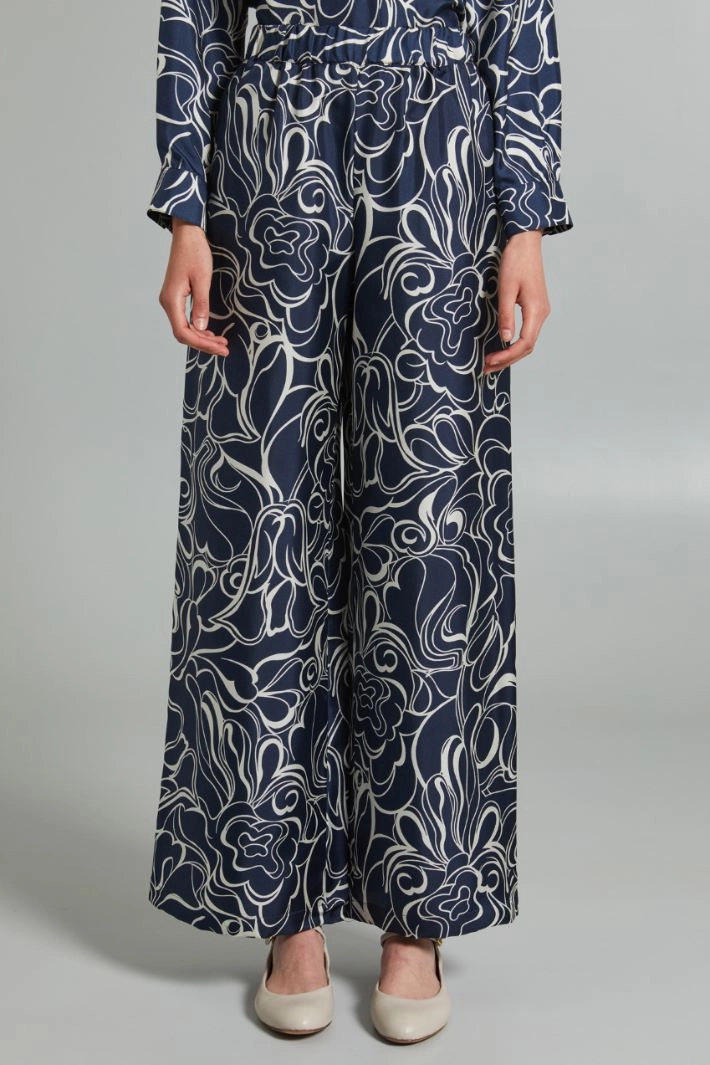 Fluid trousers in printed pure silk twill, with elastic insert at waist and French pockets.