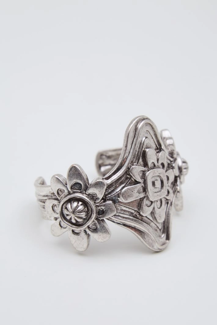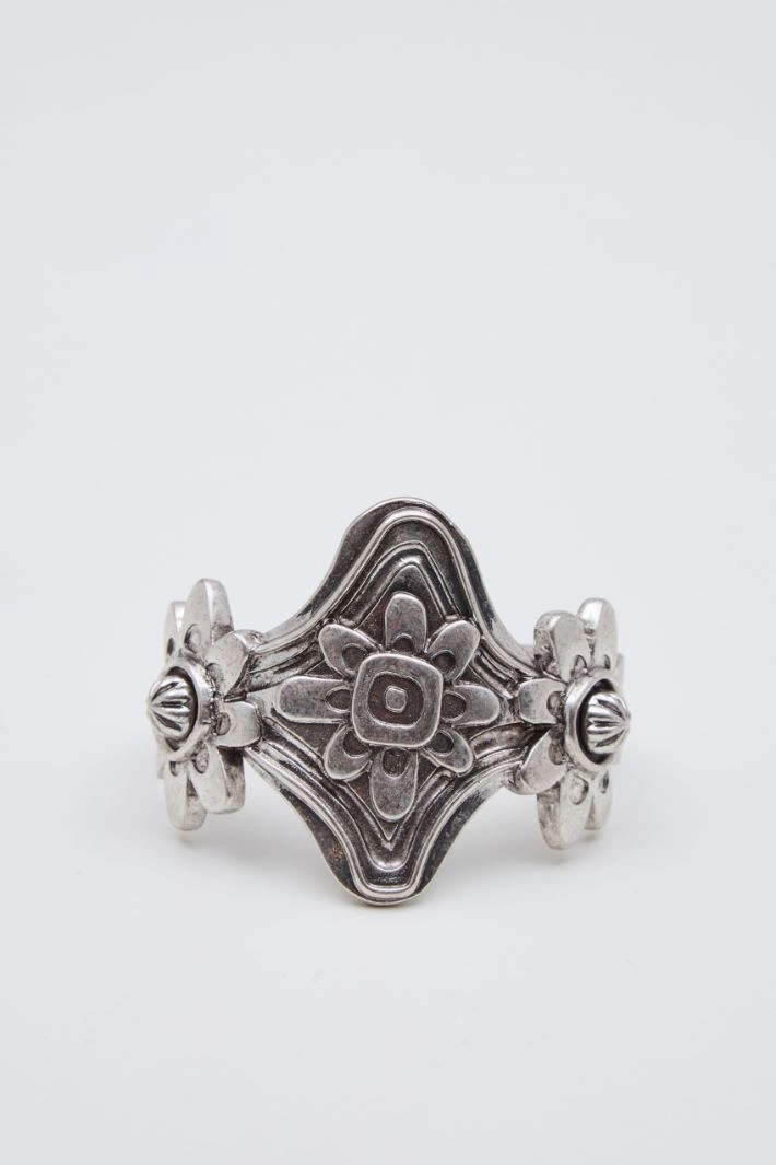 Rigid metal bracelet with flower-shaped details.