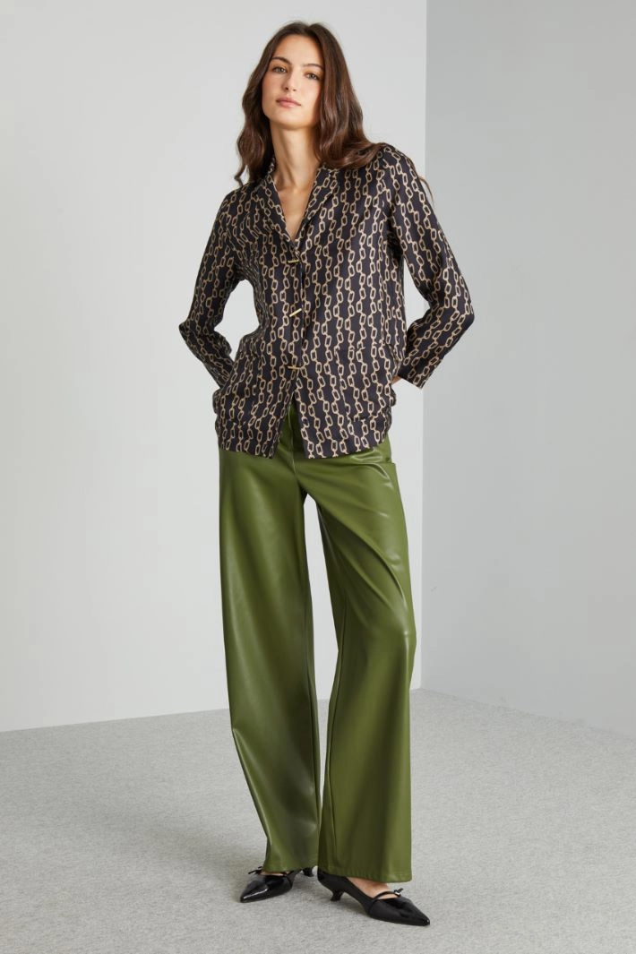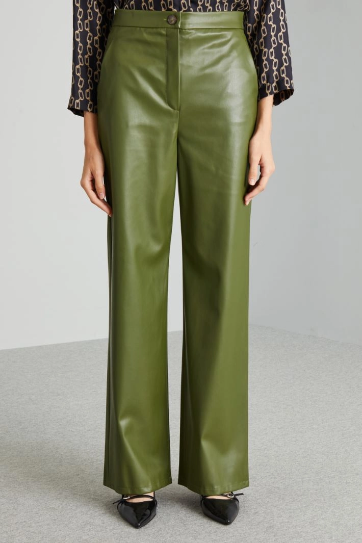 Loose-fit palazzo trousers in leather-effect coated jersey, with belt at the waist and French pockets on the front. Hidden zip and button fastening.