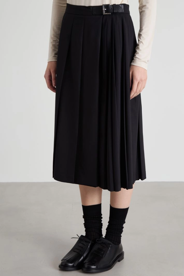 Kilt-style skirt with a flared hem in stretch wool twill, with asymmetrical pleat pattern, decorative belt detail at the waist and fastening with invisible zip and hook at the side.