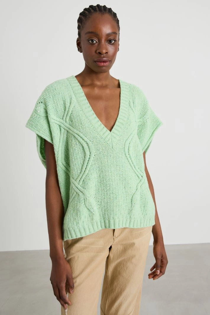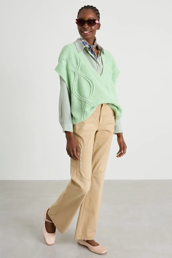 Oversized straight-fit gilet in wool blend yarn, with three-dimensional pattern and V-neck.