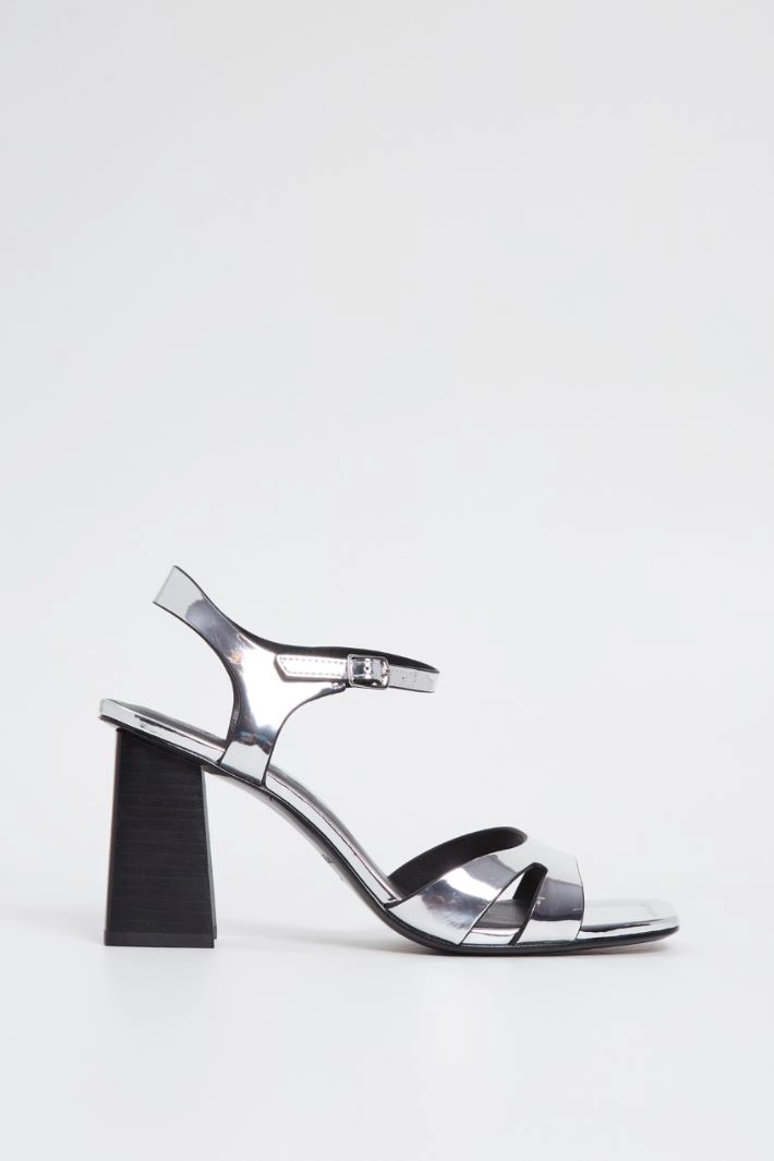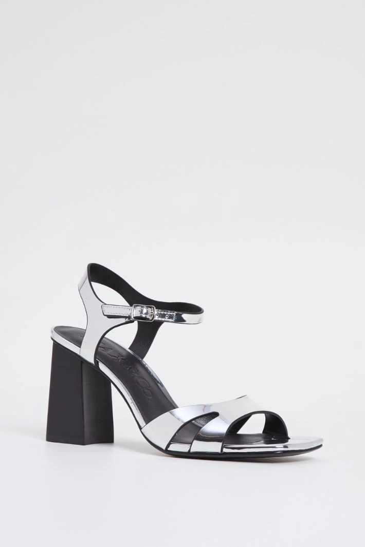 Faux leather trapezoid toe sandals with cut-out detailing on the band, wood-effect trapezoid heel and ankle strap fastening. Leather lining, leather sole.