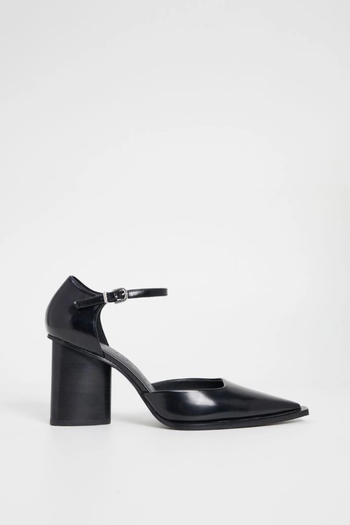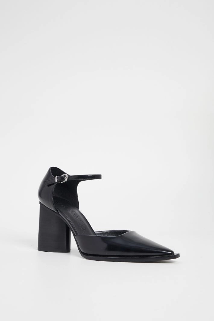 Faux leather shoes with a square neckline, pointed toe, rounded triangular column heel and adjustable ankle strap closure. Leather lining, leather sole.