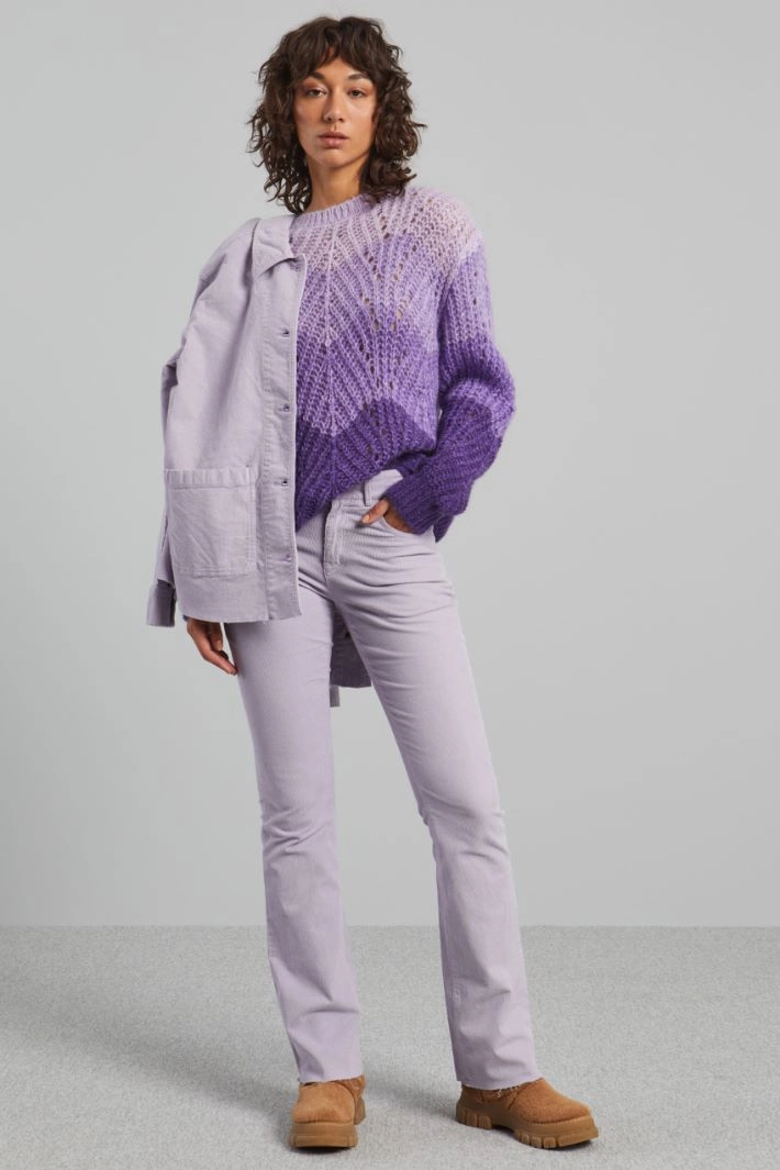 Bootcut trousers in ribbed stretch cotton velvet, with belt loops at the waist, five pockets and raw cut at the hem. Hidden zip and metal button fastening.