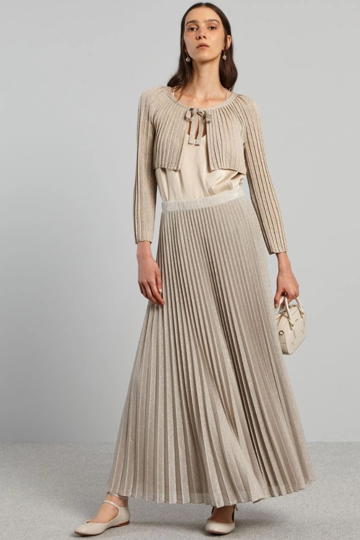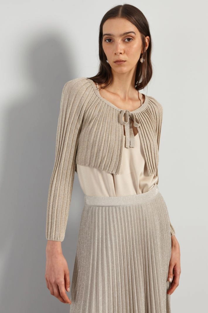 Regular-fit shrug in viscose blend yarn, with pleating and lamé fiber insert, long kimono sleeves. Fastening with ribbons to tie on the front.