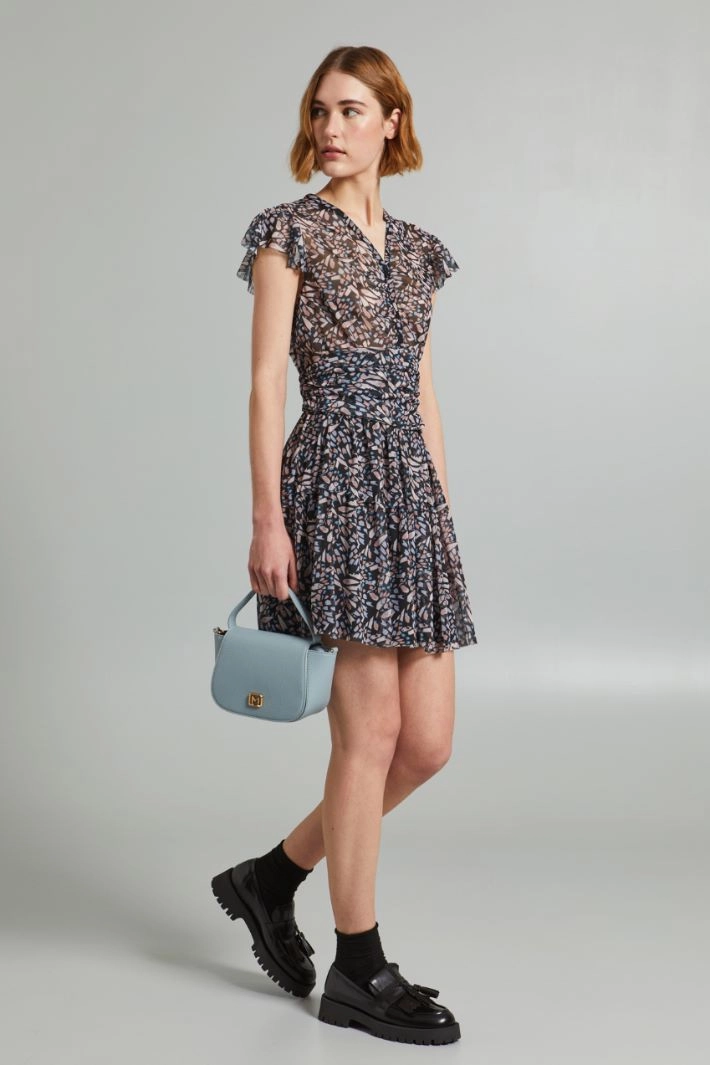 Short dress in all-over printed tulle crepe jersey, with a V-neck, short cap sleeves, gathered waist and small flounce at the bottom. Fastening with visible buttons on the front. Matching ring belt. Semi-lined.