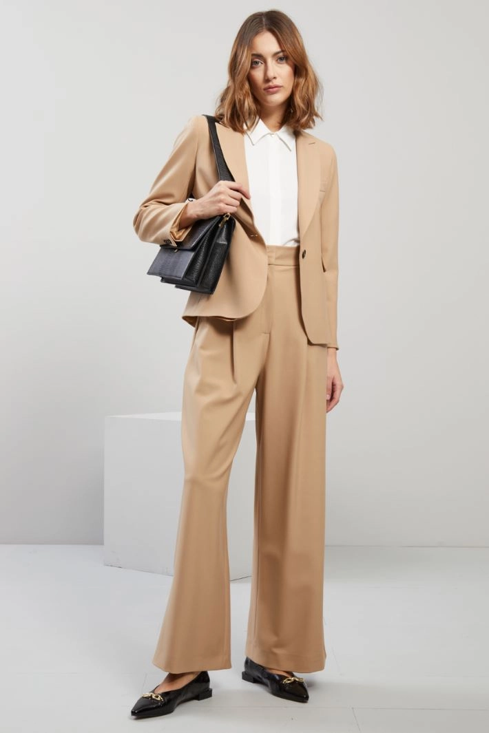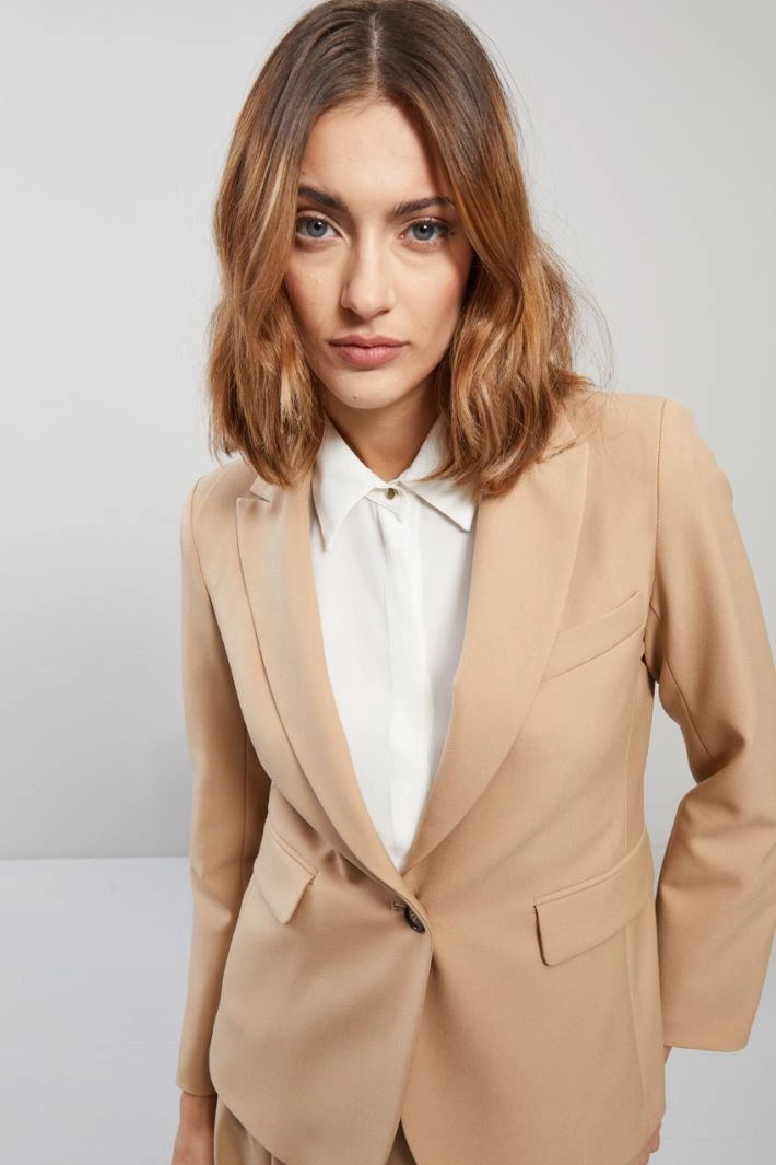 Straight cut blazer in stretch viscose fabric, with lapel collar, long sleeves with vents and buttons, welt pocket and double welt pocket with flap on the front, vent on the back. Single-breasted closure with visible button. Lined.