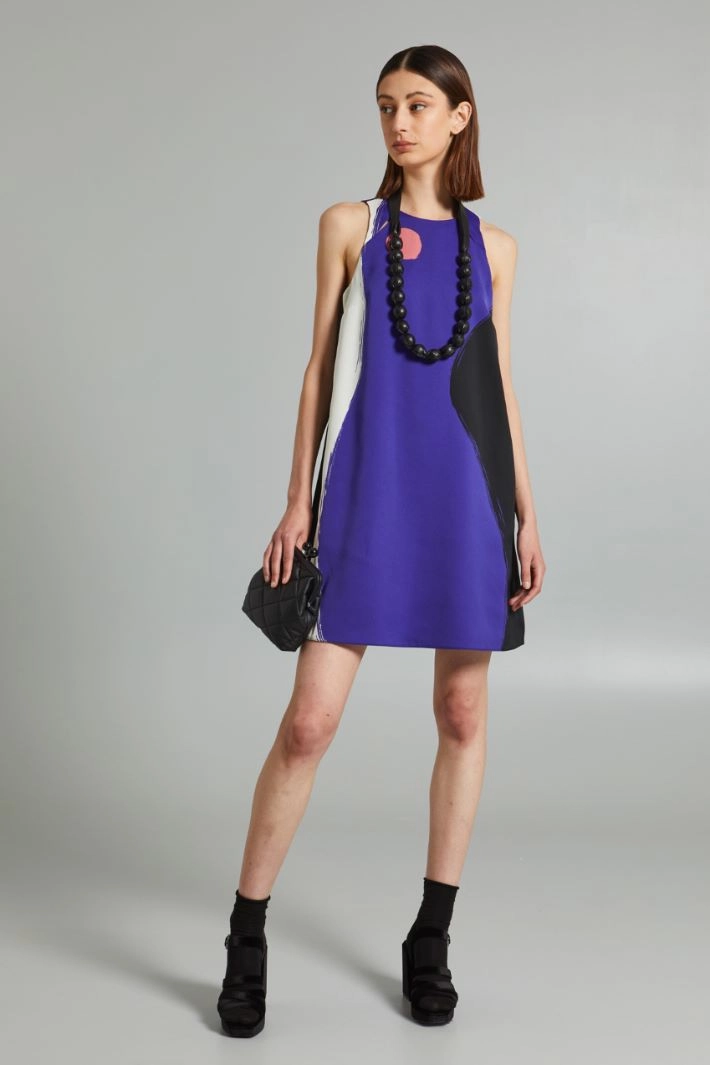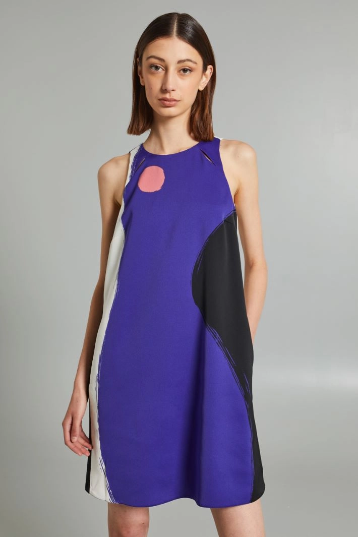 Short dress with a slightly flared line in printed shiny enver satin, with a crew neckline, cut out motif on the front, sleeveless and side pockets inserted in the seams. Invisible zip fastening on the back. Partially lined.