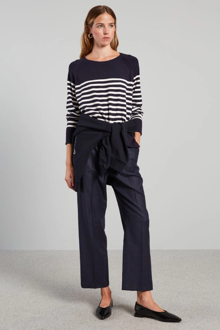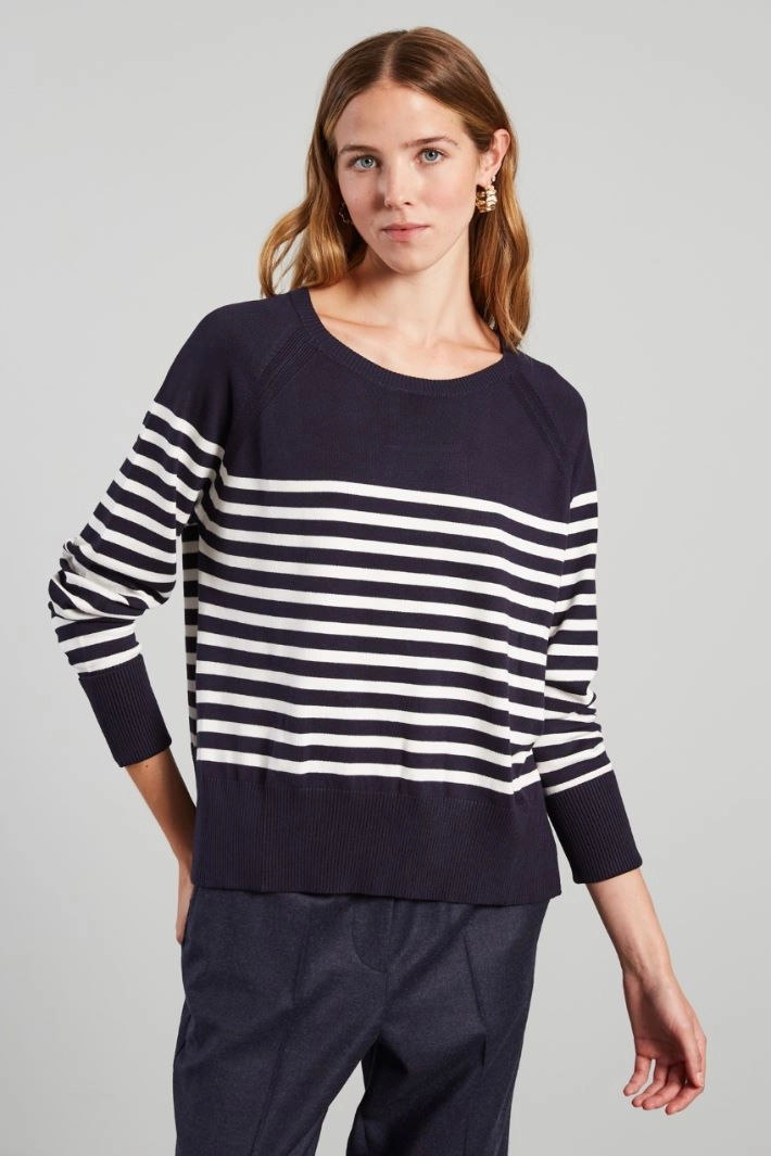 Regular fit yarn-dyed viscose blend sweater with boat neckline and turned-up cuff-embellished long raglan sleeves. Side slit-embellished hem
